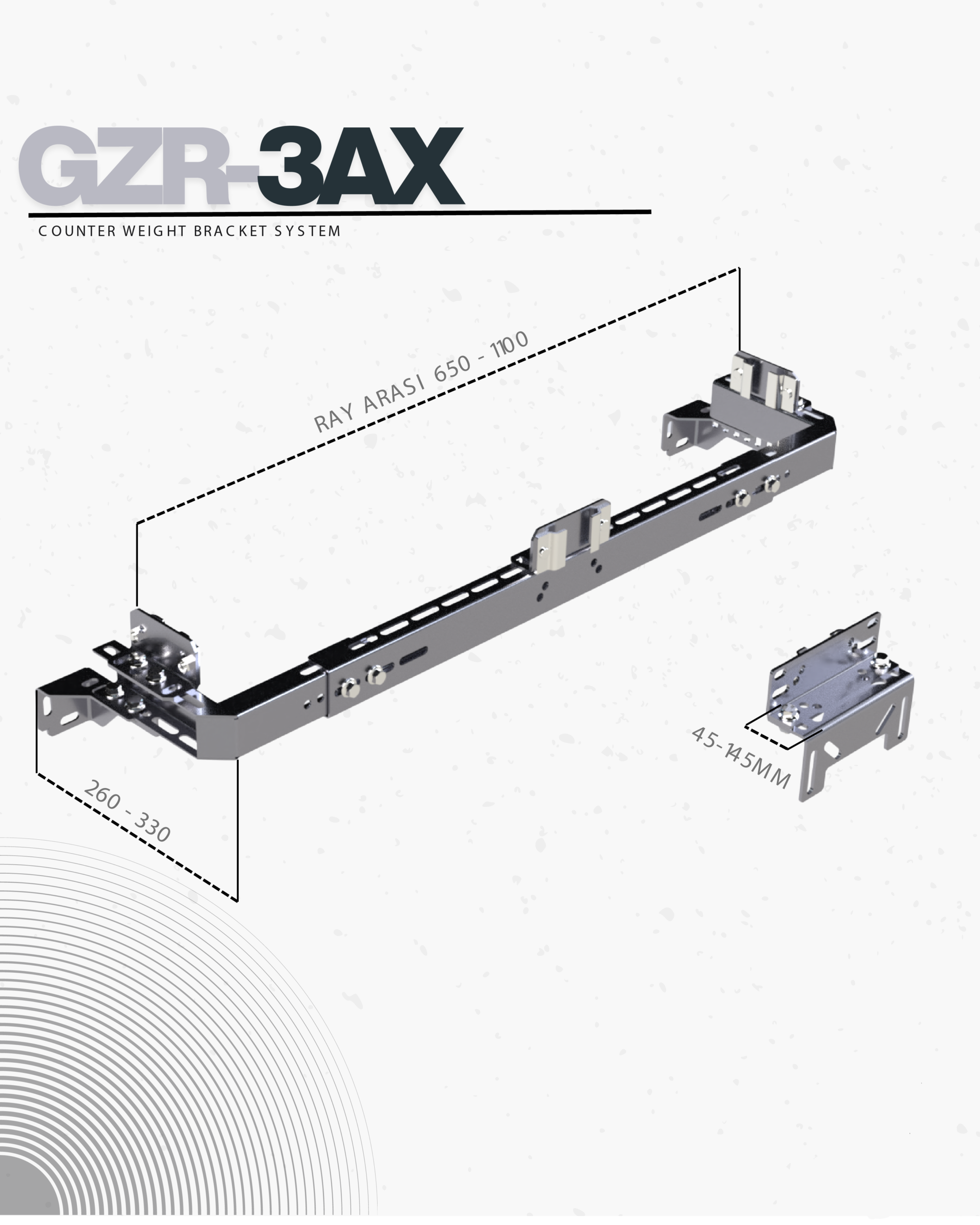 Tek sıra asansör ağırlık karkaslarına uyum sağlayacak şekilde geliştirilen bu model, 650 – 1100 mm aralığında ayarlanabilir ağırlık ray mesafesi sunar. Karşı ana ray bağlantısında ise gözer tasarımına sahip, üç farklı montaj noktasına göre ayarlanabilen ve 45 – 145 mm açılım sağlayan özel asansör ray konsolu kullanılır. Duvar mesafesi 260-330mm şeklinde ayarlanabilmektedir